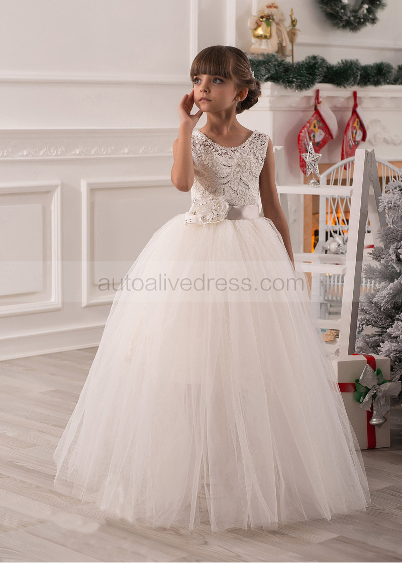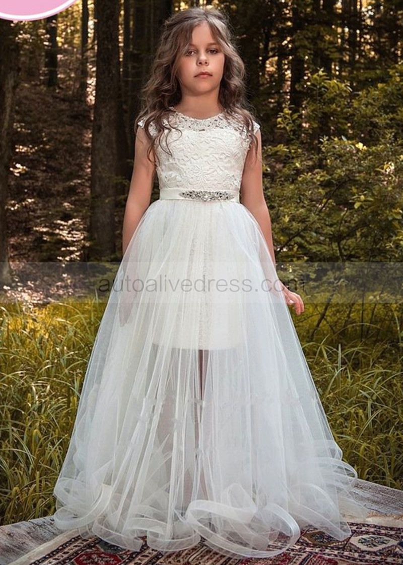 A Line Two Piece Ivory Lace Knee Length Flower Girl Dress With Detachable Tulle Skirt